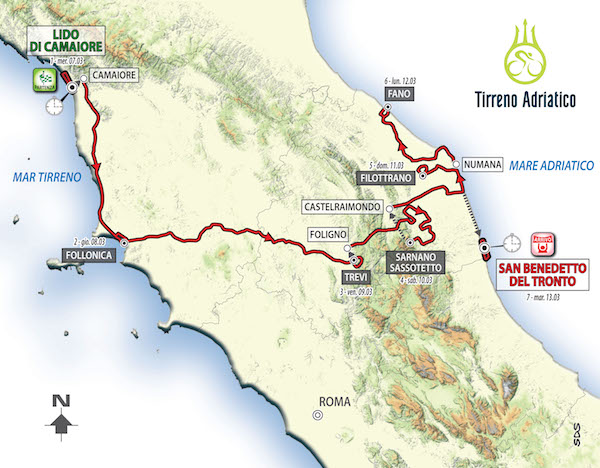 Si parte il 7 marzo con la cronosquadre di Lido di Camaiore e si chiude con la classica crono individuale a San Benedetto. Domenica 11 marzo la 5/a tappa terminerà a Filottrano, proveniente da Castelraimondo, città dell’indimenticato corridore italiano. L’arrivo in salita della corsa sarà posto ai 1.345 metri di Sassotetto. Dislivello totale della corsa, 11.000 metri.