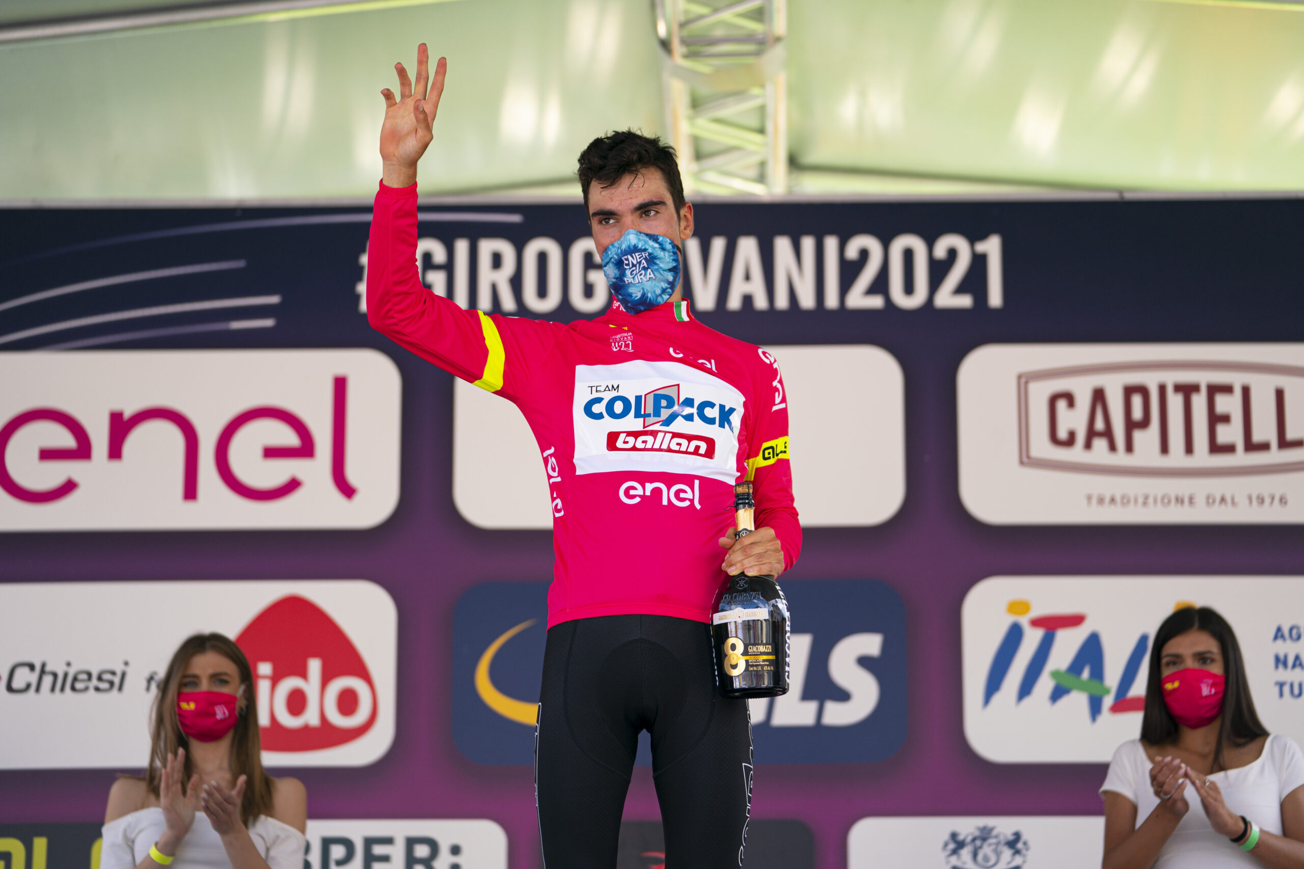 Juan Ayuso maglia rosa dopo l’ottava tappa del Giro d’Italia Under 23 2021 (foto Isolapress)
