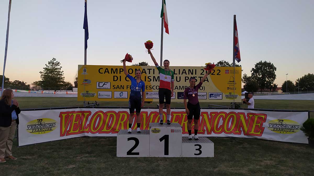 Doppietta tricolore anche per Martina Fidanza (G.S. Fiamme Oro), oro nell’Eliminazione – davanti a Chiara Consonni (G.S. Fiamme Azzurre) e a Rachele Barbieri (G.S. Fiamme Oro) – e nel Keirin, dove precede Miriam Vece (C.S. Esercito) ed Elena Bissolati (Cicli Fiorin).