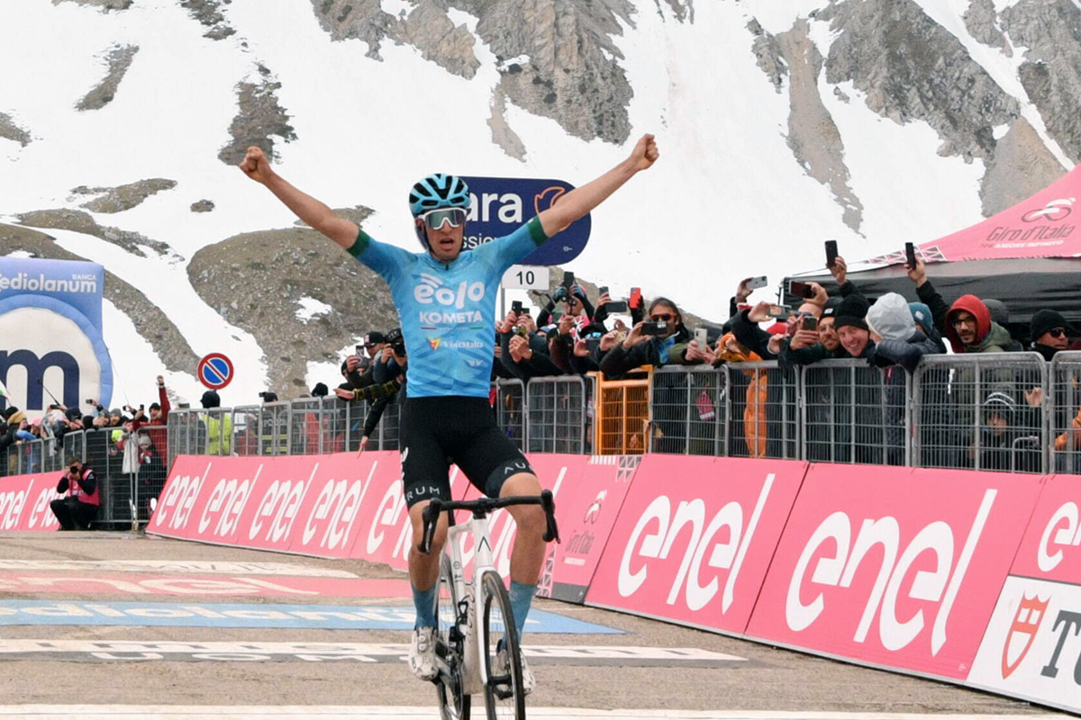 CAMPO IMPERATORE (AQ) – Tra due muri di neve, che probabilmente gli hanno ricordato le salite su cui si allena abitualmente, il trentino Davide Bais (EOLO-Kometa) ha vinto la sua prima corsa professionistica aggiudicandosi la settima tappa del Giro d’Italia, quella che portava il gruppo a Campo Imperatore (nella foto LaPresse, l’arrivo).