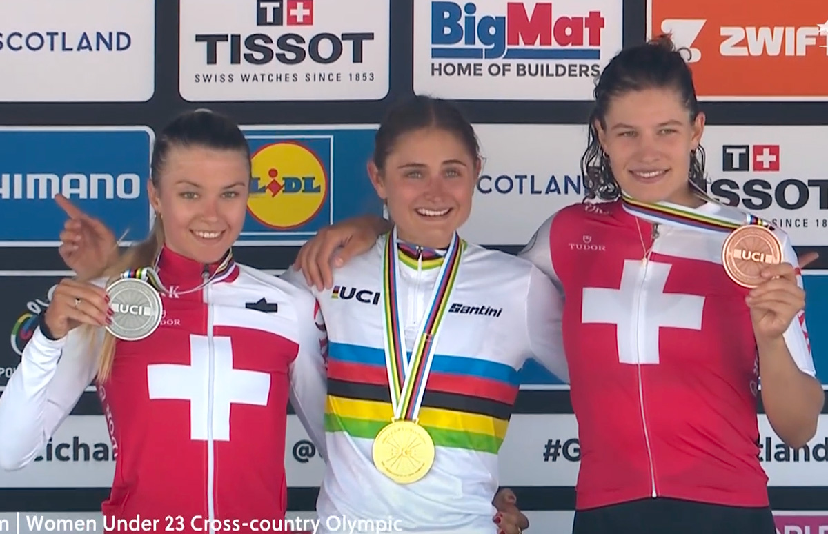 Il podio della prova iridata Xco delle U23 di Glasgow vinta da Samara Maxwell