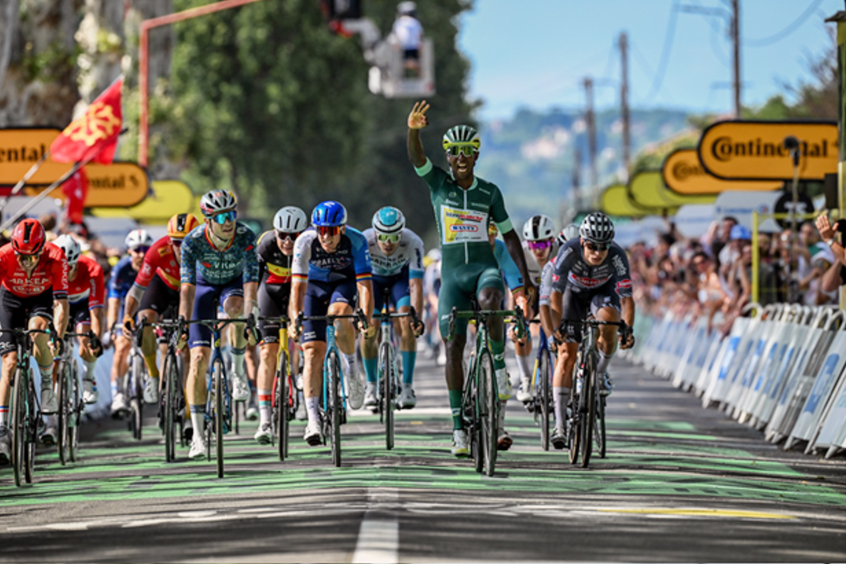 VILLENEUVE SUR LOT (FRA) – Si dice che lottare per la maglia verde a ogni traguardo volante prosciughi le energie nel finale, come testimoniato, negli ultimi anni, da Peter Sagan; assioma che non vale per Biniam Girmay, che a Villeneuve-sur-Lot si è aggiudicato la 12esima tappa del Tour de France portando a tre il computo dei successi in questa edizione della Grande Boucle (nella foto di Billy Ceusters / A.S.O. l’arrivo).