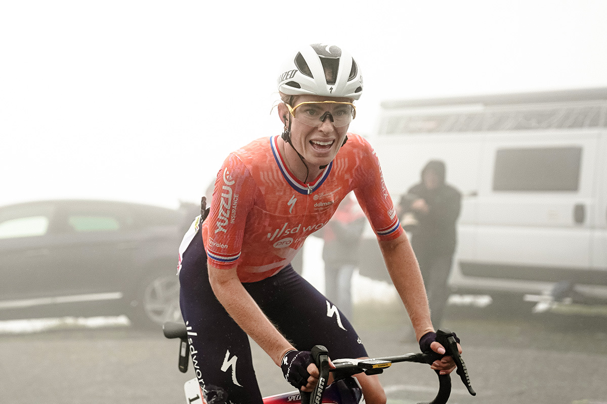 Gli ultimi 14 km si sono così trasformati in una sfida a tre, fatta di smorfie, momenti di difficoltà e scatti effettuati con le energie al lumicino. Davanti Demi Vollering ha provato a forzare, sia per togliersi di ruota la compagna di avventura, sia per guadagnare quei 70″ necessari per sfilare il simbolo del primato a Niewiadoma; negli ultimi 5 km, però, l’olandese ha pagato inesorabilmente gli sforzi profusi e il cronometro ha iniziato a condannarla, con il ritardo della maglia gialla che si è contratto secondo dopo secondo, passando dal 1′ e 10″ ai 46″.