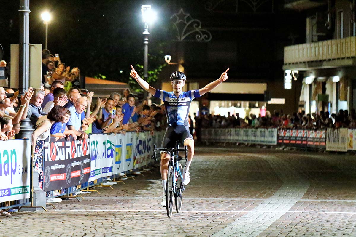 Con un attacco deciso sferrato all’ultimo giro, il corridore veneto ha sorpreso gli altri compagni di fuga e ha vinto con 6 secondi di vantaggio sul Elia Tovazzi (Carnovali Rime Sias) e Pier Elis Belletta (Namedsport – Uptivo).