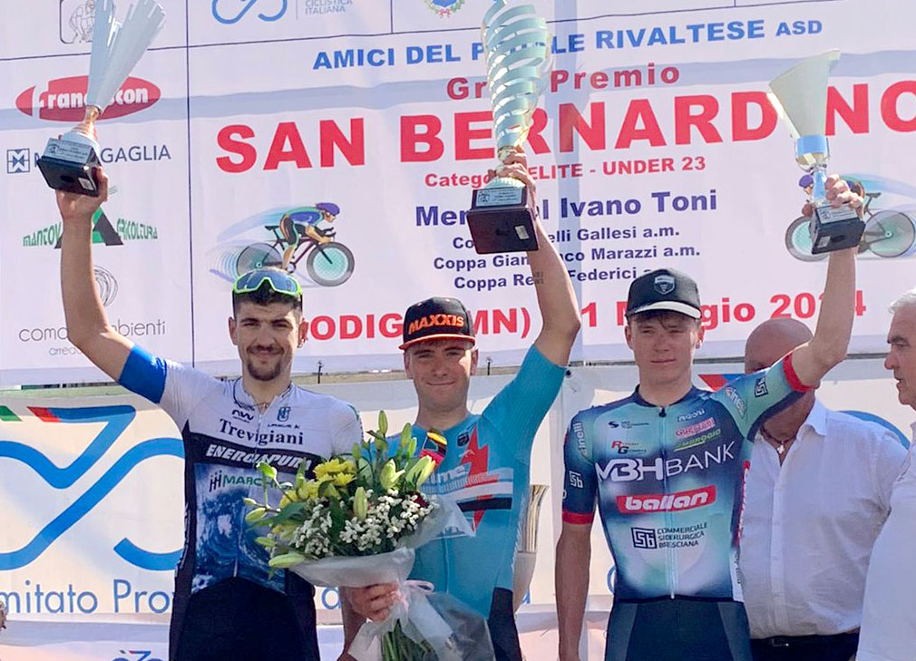 RODIGO (MN) – Un sabato da incorniciare per la Solme Olmo e soprattutto per Andrea Chiarucci che ha conquistato il 46° Gp San Bernardino. 123 km disegnati su di un circuito completamente pianeggiante. Il classe 2000 ha preceduto in volata Matteo Zurlo (U.C Trevigiani) e Gabriele Casalini (Team MBH Bank Colpack Ballan).