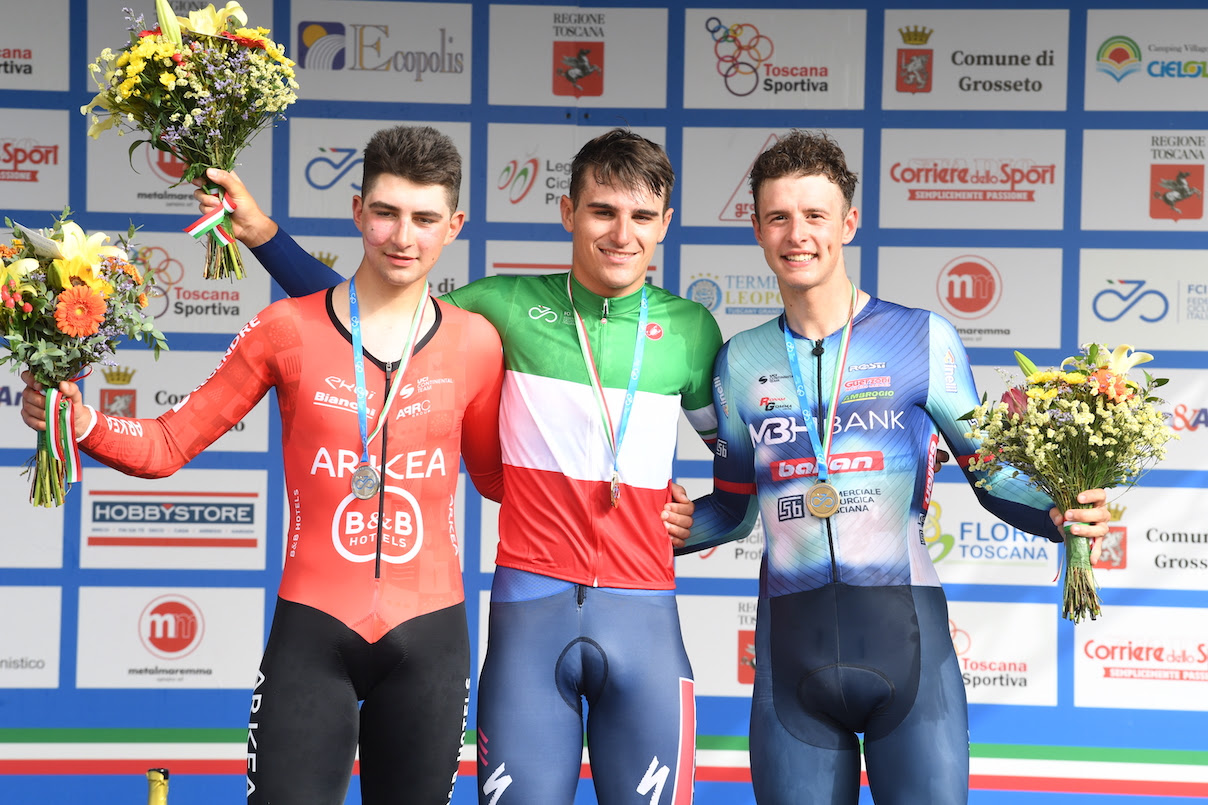 Il ventenne genovese del Soudal Quick Step Devo Team, ha coperto i 23,2 km in programma in 27′ e 18″, alla media di 49,6, lasciandosi alle spalle il bergamasco Nicolas Milesi (Arkea B&B Hotels), staccato di 25”, e il varesino Christian Bagatin (MBH Bank Colpack Ballan CSB), terzo a 34″ (nella foto Rodella, il podio).