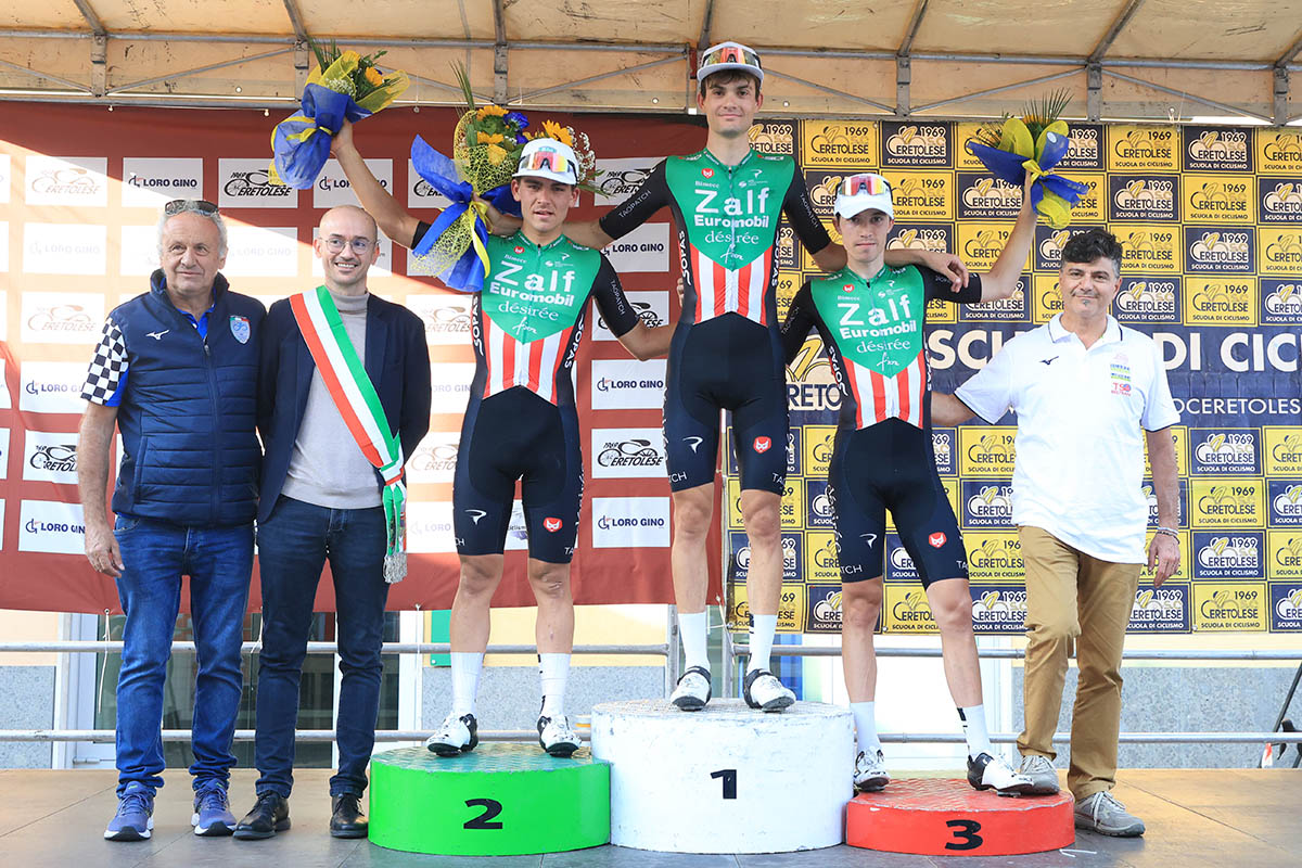 CASALECCHIO DI RENO (BO) – Sa di assoluto trionfo la decima vittoria stagionale della Zalf Euromobil Désirée Fior che quest’oggi ha monopolizzato il podio del 42° Piccolo Giro dell’Emilia per merito di Giovanni De Carlo, Federico Iacomoni e Simone Raccani (nell’immagine Photors.it, il podio).