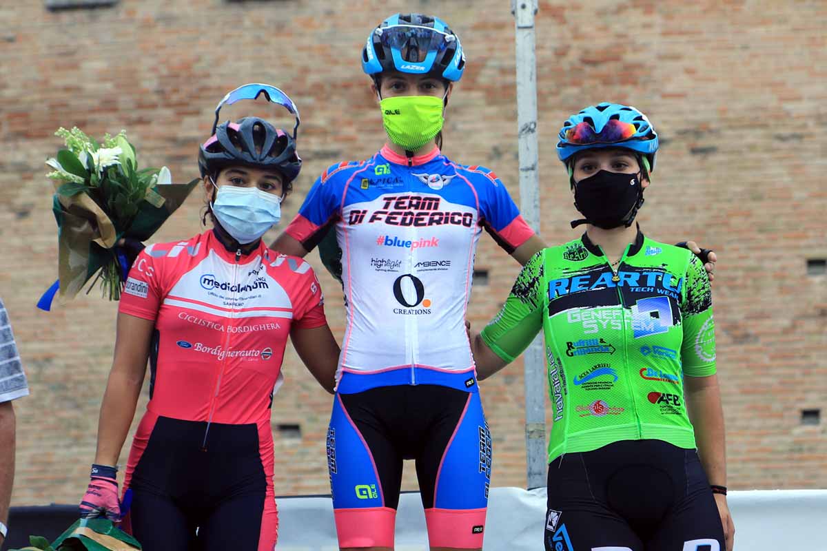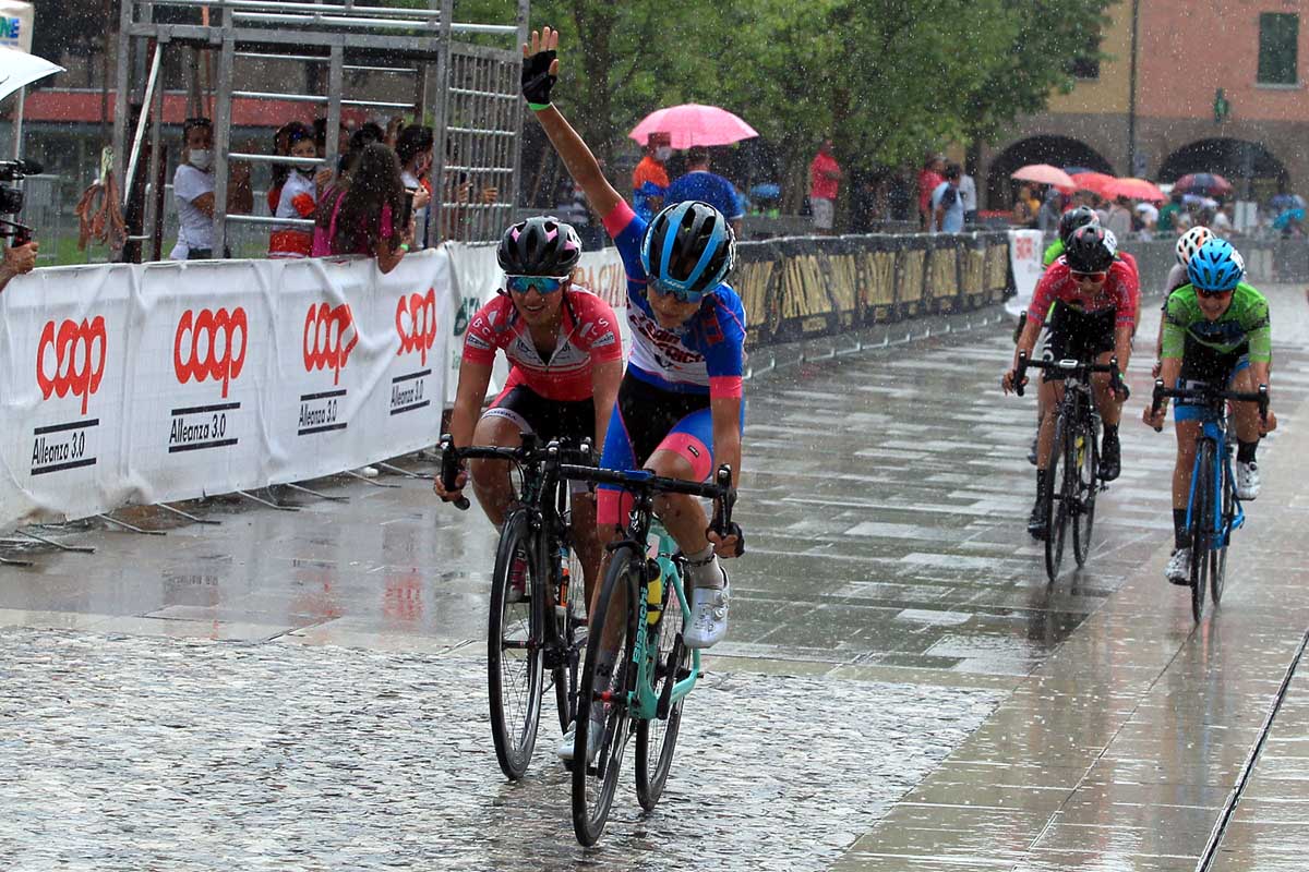 A meno tre giri dal termine inizia a cadere qualche goccia, che si trasforma in pioggia poco dopo. Al suono della campana, proprio sul tratto in pavé che precede il traguardo, una caduta in fondo al gruppo mette fuori gioco qualche atleta. Una seconda caduta a poche centinaia di metri dal traguardo “spacca” il gruppo. Lo sprint per il successo, sotto una pioggia ormai copiosa, diventa un testa a testa tra Serena Brillante Romeo (Ciclistina Bordighera) ed Eleonora Ciabocco (Team Di Federico), che solo per una manciata di centimetri riesce a precedere l’avversaria. Alle loro spalle la romagnola Valentina Zanzi (Re Artù) regola in volata Martina Sanfilippo (VO2 Team Pink) ed Elisa De Vallier (Top Girls Fassa Bortolo).