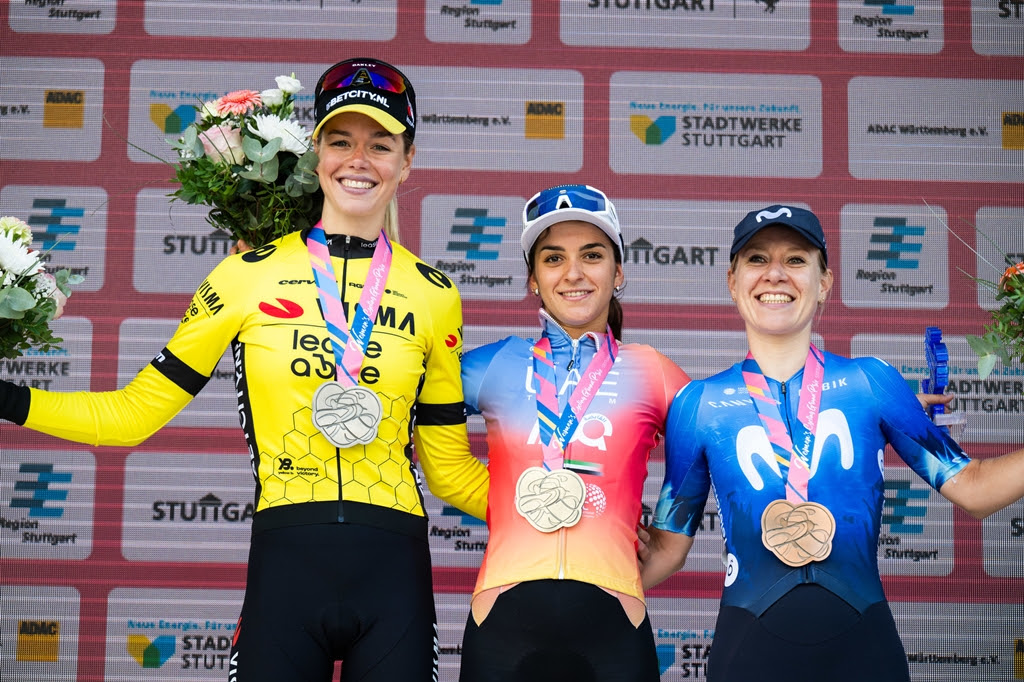 Dopo 118.2 km da Böblingen a Stoccarda, l’italiana si è lasciata alle spalle Lieke Nooijen (Team Visma | Lease a Bike) e Mareille Meijering (Movistar Team).