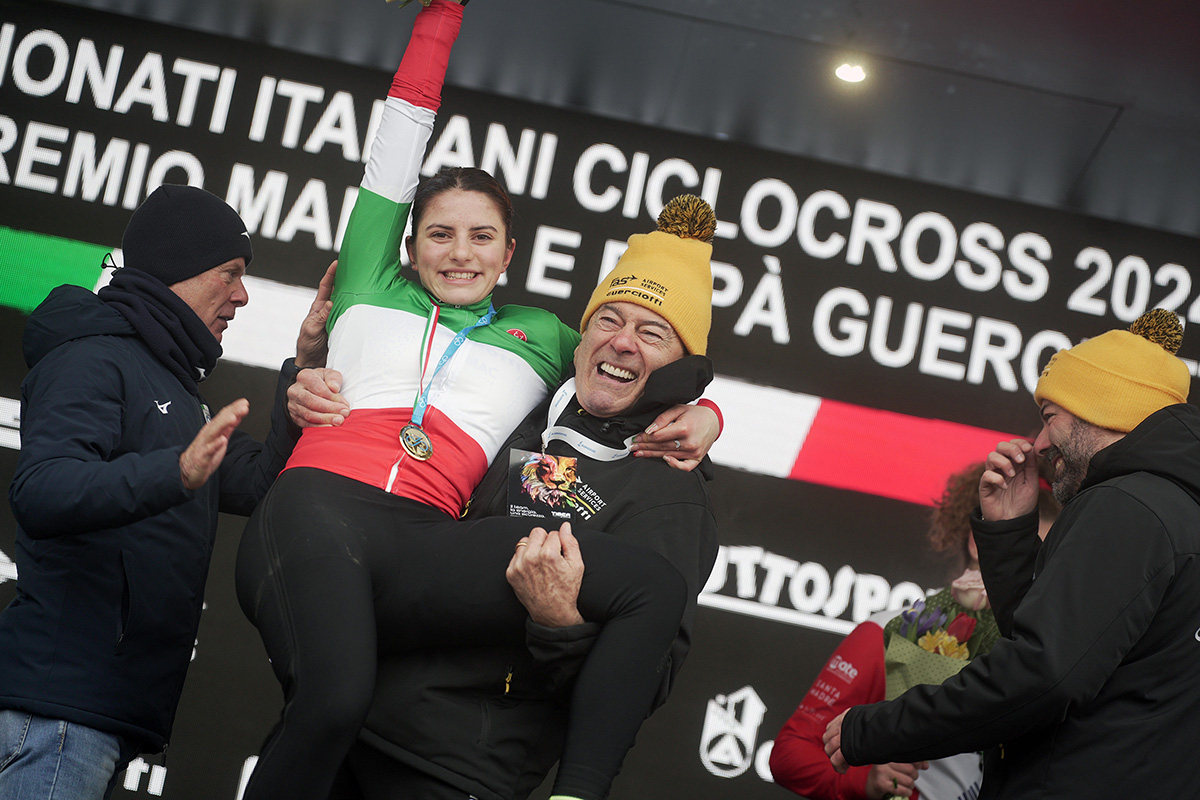CREMONA (CR) – Va sulle spalle della toscana di San Giovanni Valdarno Elisa Ferri la maglia tricolore delle donne junior, titolo assegnato questa mattina al Parco al Po di Cremona in occasione del 44° Gran Premio Mamma e Papà Guerciotti. La portacolori della FAS Airport Services Guerciotti Premac, sodalizio organizzatore della rassegna tricolore, ha preso immediatamente il largo, guidando con consapevolezza e commettendo pochissimi errori su un tracciato veloce ma ghiacciato e che quindi riservata insidie e tranelli a ogni cambio di direzione (nella foto De Negri, l’atleta con patron Paolo Guerciotti).
