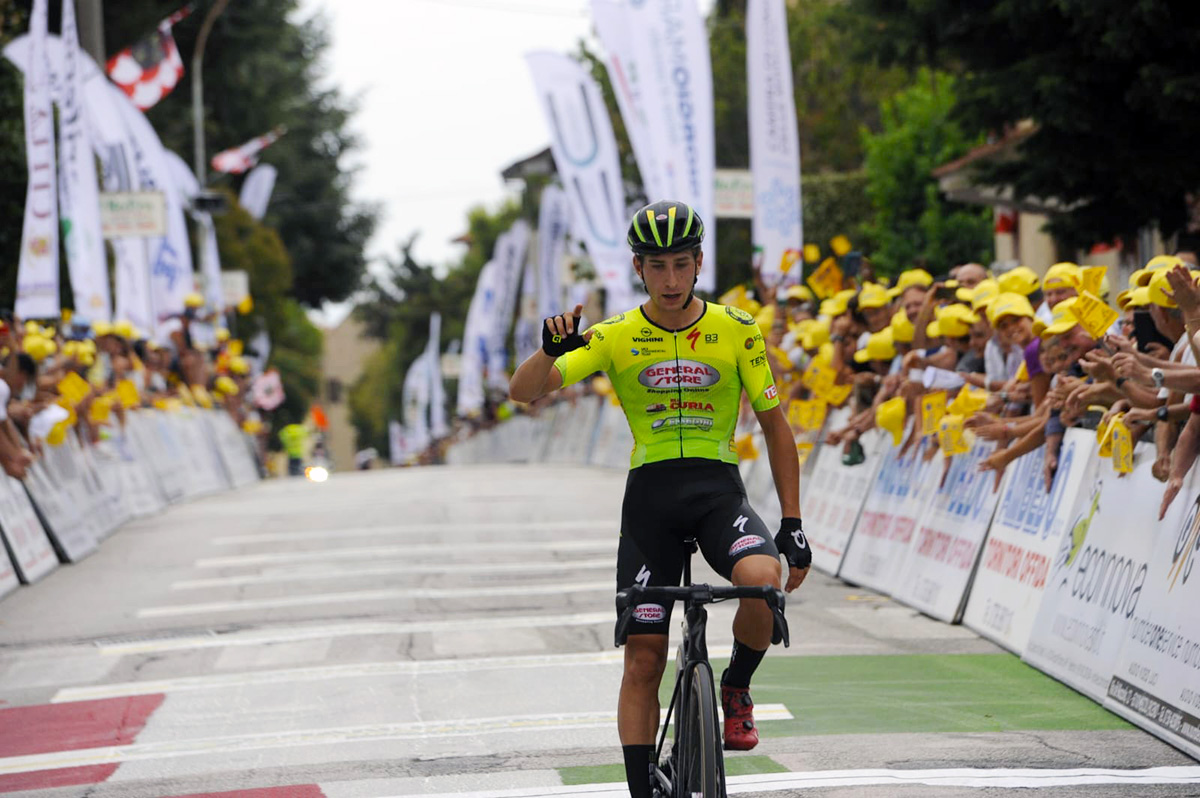 Dopo la commemorazione al monumento dedicato a Fabio Casartelli, i 164 partenti si alzano sui pedali e percorrono i sei chilometri di trasferimento fino a Porto San Giorgio, da dove viene dato il via ufficiale. Durante i giri pianeggianti, al chilometro 23 attacca Roman Ermakov della CTF Victorious, al cui inseguimento si porta Aronne Antonetti del VC Mendrisio, al quale si aggiungono Riccardo Lorello dell’Hopplà-Petroli Firenze-Don Camillo e Roberto Bottaro del VC Mendrisio. Attorno al chilometro 31 gli inseguitori chiudono sul fuggitivo: quattro al comando. Sono loro ad attaccare la prima ripetizione della salita che porta a Capodarco. Antonetti in primis e Lorello poco dopo si staccano e in testa rimangono in due. Attorno al chilometro 56 Filippo D’Aiuto della General Store-Essegibi-F.lli Curia rientra sui battistrada. All’inizio della seconda ripetizione della salita Bottaro perde contatto e in testa rimangono Ermakov e D’Aiuto, mentre al loro inseguimento si portano otto corridori, che al chilometro 79 piombano sui fuggitivi: dieci al comando. Il drappello si va via via rinfoltendo, finché al chilometro 112 in testa sono segnalate oltre 30 unità. Il gruppo si va poi assottigliando fino a quando al comando restano in undici: Diego Bracalente del MBHBank Colpack Ballan CSB, Nicolò Arrighetti del Biesse-Carrera, Bryan Olivo del CTF Victorious, Filippo D’Aiuto del General Store-Essegibi-F.lli Curia, Manuel Oioli del Q36.5 Continental Cycling Team, Cesare Chesini della Zalf Euromobil Desiree Fior, Dennis Lock della Zalf Euromobil Desiree Fior, Dominik Dunár dello Slovak National Team, Simone Griggion dell’Uc Trevigiani Energiapura Marchiol, George Wood della Zappi Racing Team e William Harding della Zappi Racing Team. Dai fuggitivi, poco prima del chilometro 140, si stacca Olivo. Nel penultimo giro, lungo la salita allunga Dunár, che da solo affronta la prima ripetizione del “muro” di Capodarco, scollinando con circa 15” di vantaggio sugli inseguitori. Su di lui, in discesa, rientra poi D’Aiuto. Saranno loro due a lottare per la vittoria.