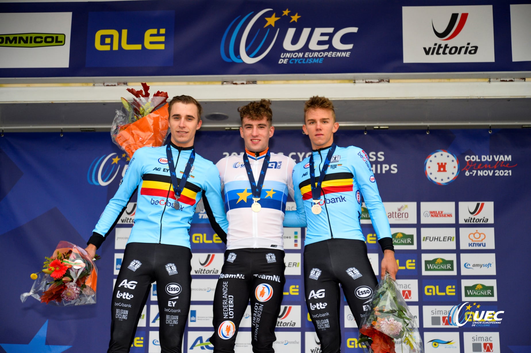 Il podio del Campionato Europeo ciclocross Under 23 2021 a Col du Vam (foto UEC/BettiniPhoto)