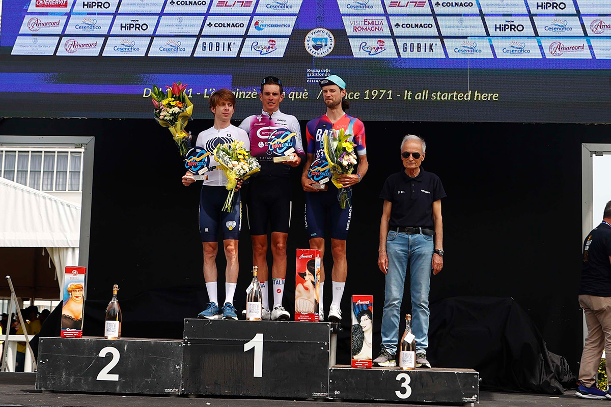 CESENATICO (FC) – Subito dopo aver vinto la BGY Airport Granfondo si era proiettato sull’impegno odierno, definendo la Nove Colli “il mondiale degli emiliani”; e oggi Manuel Senni ha completato l’opera aggiudicandosi per la seconda volta l’ambita granfondo, che oggi ha vissuto la sua 53esima edizione (nella foto, il podio del percorso di 200 km).