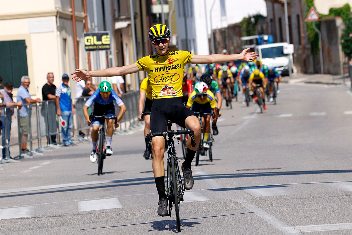 ERBÈ (VR) – Con un gioco si squadra magistrale, la Fiumicinese centra la doppietta al 3° Trofeo Città di Erbè – 2° Memorial Paolo Dainese per merito del fuggitivo Nicola Miraglia, che ha resistito per soli 2″ al ritorno del gruppo, e di Andrea Decarli, che allo sprint ha regolato il gruppo degli inseguitori (nello scatto di Photobicicailotto, l’arrivo).