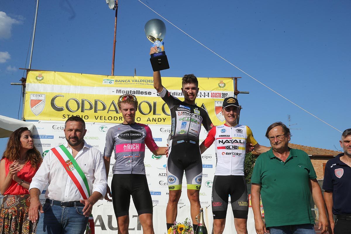 MONTALLESE DI CHIUSI (SI) – Il marchigiano Raffaele Radice (VPM Porto Sant’Elpidio), con uno spunto prepotente, ha vinto lo sprint a tre che oggi ha deciso la 50esima edizione della Coppa Grand’Ufficiale Francesco Bologna per Elite e Under 23 corsa a Montallese di Chiusi, nel Senese.