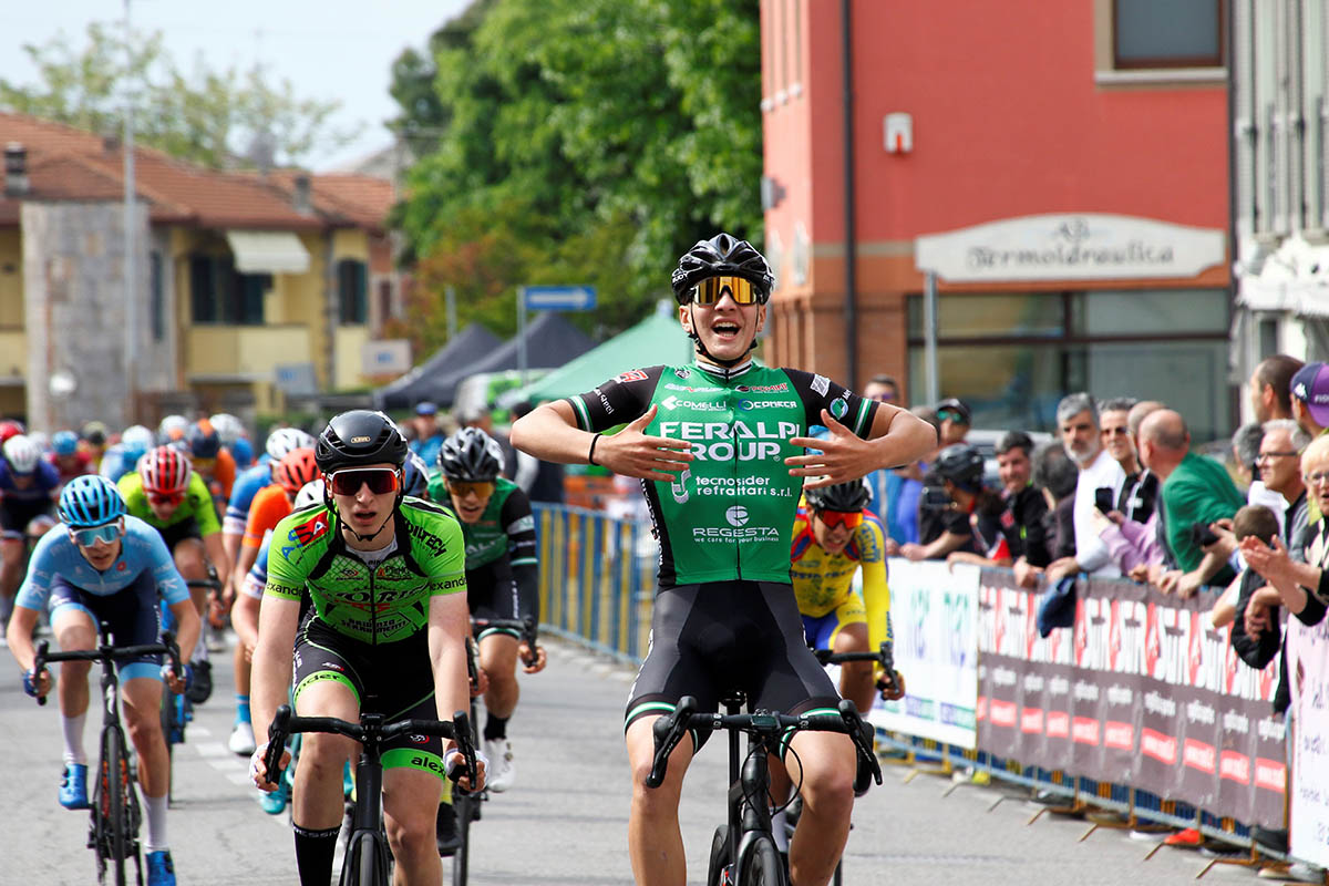 OSIO SOTTO (BG) – Il rettilineo di Corso Vittorio Emanuele di Osio Sotto regala al bresciano Riccardo Natale (Feralpi Monteclarense) la prima vittoria nella categoria allievi; l’atleta classe 2008, al termine di una prova volata via a una media superiore ai 44 chilometri orari, ha vinto il 31° Gran Premio 1° Maggio precedendo allo sprint la coppia della Cicli Fiorin formata da Lorenzo Milani e Cesare Castellani (nella foto Berry, l’arrivo).