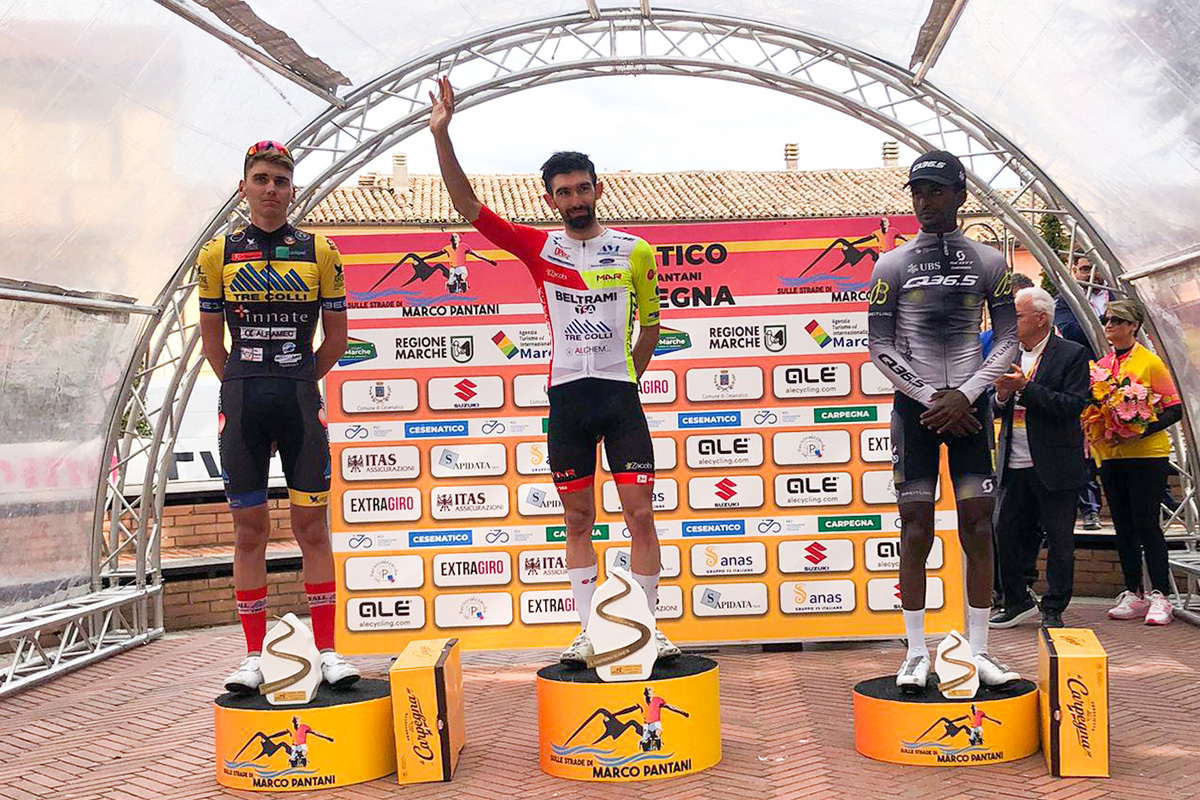 CARPEGNA (FC) – Sulle strade di Marco Pantani si esalta il parmense Thomas Pesenti (Beltrami TSA Tre Colli) che, dopo essersi fatto la gamba partecipando al Giro di Sicilia, ha vinto la sua prima gara stagionale. Nella prova nazionale per Elite e Under 23 organizzata da ExtraGiro, il ragazzo di Fontanellato ha tagliato il traguardo in completa solitudine, precedendo di un minuto Luca Cavallo (Overall Tre Colli) e di 1′ e 46″ Araya Nehom Zeray, portacolori del Q36.5 Continental Team (nella foto di Beltrami TSA Tre Colli, il podio).