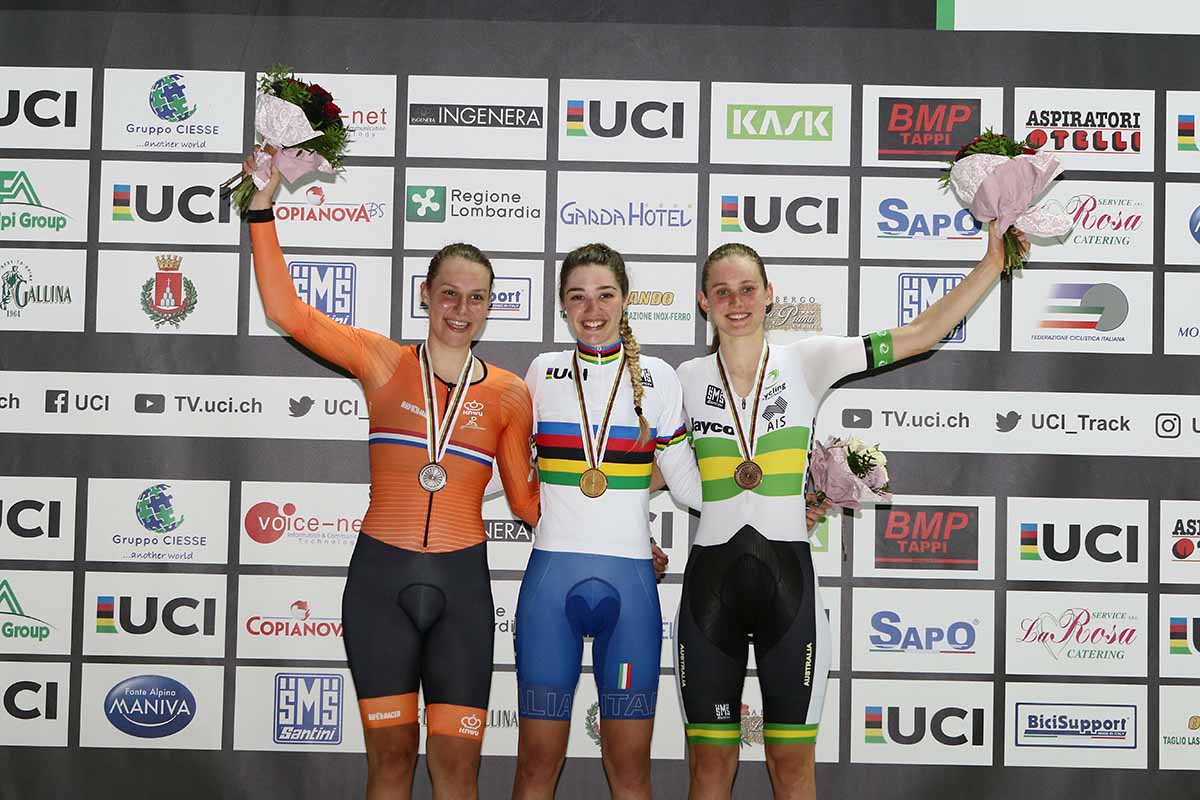 Martina Fidanza, diciassettenne proveniente da Brembate Sopra (Bergamo) e figlia dell’ex professionista Giovanni, affronta lo Scratch nel migliore dei modi e conquista uno splendido oro battendo l’olandese Mylene De Zoete, argento al traguardo e l’australiana Alexandra Martin-Wallance.