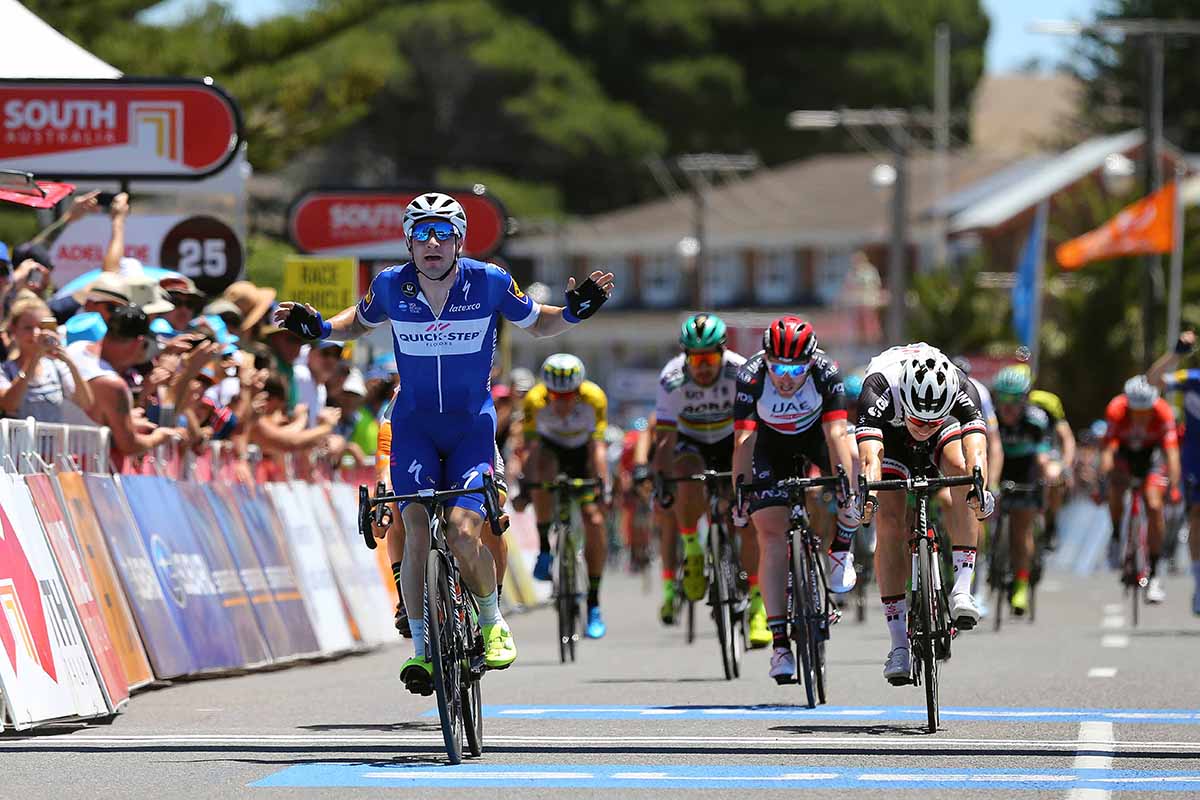 VICTOR HARBOR (AUSTRALIA) – Elia Viviani centra il primo successo della stagione e il primo in maglia Quick-Step Floors nella terza tappa del Santos Tour Down Under, da Glenelg a Victor Harbor, accorciata a 121 km per via del caldo estremo (temperature arrivare a 47°C).