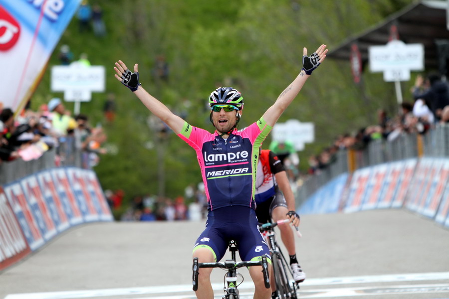 MONTECOPIOLO (PU) – Freddo, preciso, chirurgico e spietato. Diego Ulissi si esalta con un’altra formidabile vittoria nell’ottava tappa del Giro d’Italia, 179 chilometri da Foligno a Montecopiolo, superando e battendo il croato Robert Kiserlovski (Trek Factory Racing) sull’arrivo in salita. Per il corridore toscano della Lampre-Merida si tratta della seconda vittoria di tappa al Giro, dopo quella di mercoledì a Viggiano. Terzo posto a 6″ per il giovane olandese Wilco Kelderman (Belkin), quarto Nairo Quintana(Movistar Team) e quinto, a 8″, l’australiano Cadel Evans (BMC) che è anche la nuova maglia rosa del Giro (nella foto Photobicicailotto, l’arrivo e sotto la maglia rosa).