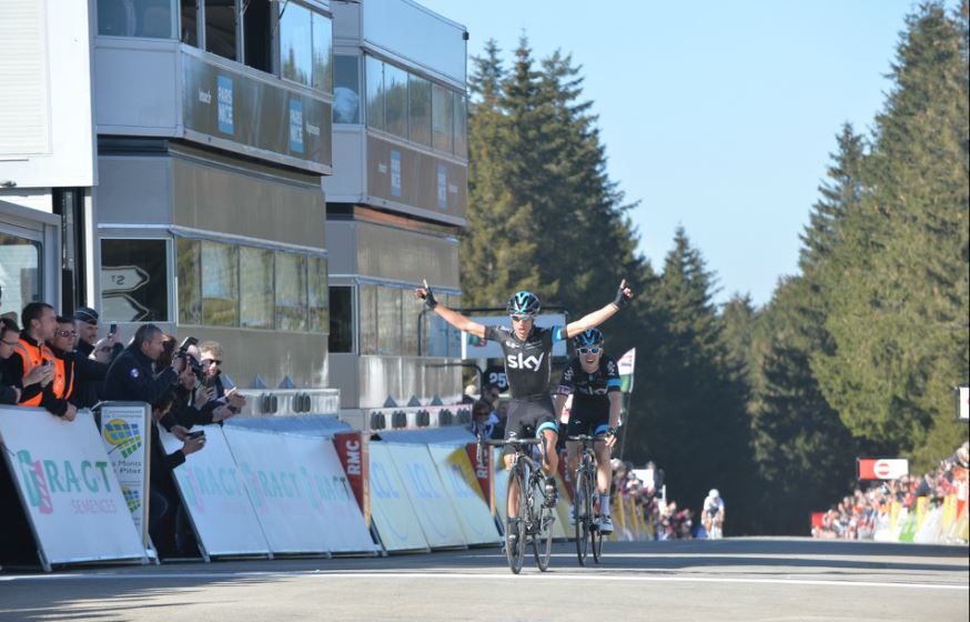 CROIX DE CHAUBOURET (FRANCIA) – Grande giornata per il Team Sky allaParigi-Nizza con una splendida doppietta nella quarta tappa da Varennes-sur-Allier e arrivo in cima a Croix de Chaubouret. Vince l’australiano Richie Porte davanti al compagnoGeraint Thomas, secondo, con il polacco Michal Kwiatkowski (Etixx-QuickStep), terzo a 8 secondi, si è ripreso la maglia gialla di leader della classifica generale (foto ASO).