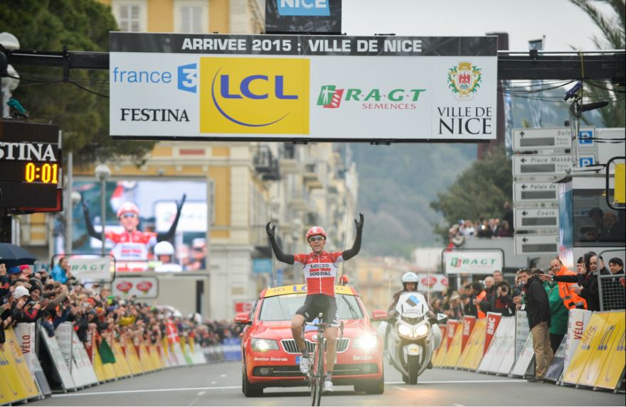 NIZZA (FRANCIA) – Vittoria solitaria di Tony Gallopin nella sesta tappa della Parigi-Nizza con il francese che balza anche al comando della classifica generale ad una sola giornata dal termine, la cronoscalata al Col d’Eze di 9,5 km. Il corridore della Lotto Soudal è uscito dal gruppo della maglia gialla Michal Kwiatkowski(Etixx-QuickStep) quando mancavano circa 30 chilometri al traguardo, mettendo in atto un’azione poderosa, sotto la pioggia, che gli ha permesso di presentarsi tutto solo sul traguardo di Nizza con 32 secondi di vantaggio su un terzetto composto daSimon Spilak (Team Katusha), Alberto Rui Costa (Lampre-Merida) e Jakob Fuglsang(Astana), rispettivamente secondo, terzo e quarto (foto ASO).