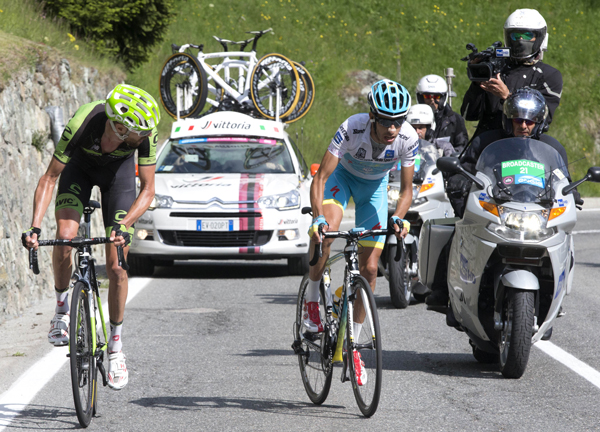 Quando inizia l’ultima salita verso Cervinia, Visconti è ancora tutto solo davanti con un solo minuto ormai di vantaggio sul gruppo ancora con tutta l’Astana schierata nelle prime posizioni. E ben presto il gruppo va a riprendere anche il siciliano e torna compatto
