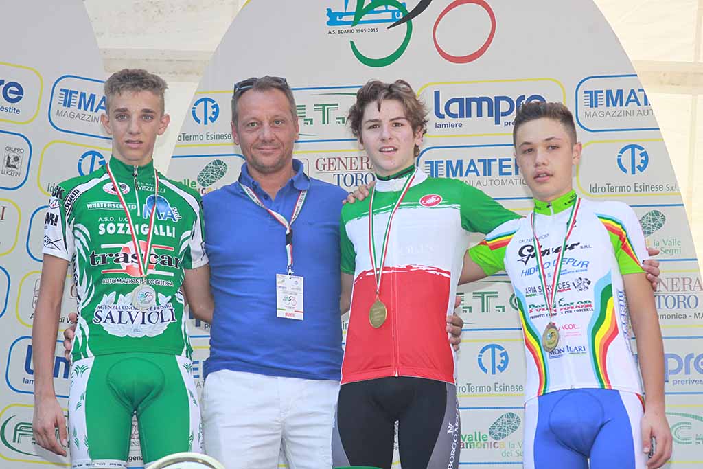 DARFO BOARIO TERME (BS) – Epilogo con volata a ranghi compatti nel Campionato Italiano Esordienti 1° anno e vittoria, sul traguardo di Darfo Boario Terme, per il veneto Luca Martignago (Borgo Molino Rinascita Ormelle) che si è lasciato alle spalle un altro dei super favoriti e plurivincitore di stagione l’emiliano Francesco Calì(Sozzigalli) e il toscanoLorenzo Peschi (Ciclistica S. Miniato – S. Croce Arno). Curiosità: con questa vittoria il neo campione d’Italia Martignago ha pareggiato il conto di vittorie stagionali con il secondo classificato Calì, entrambi ora sono a quota 11 successi nel 2015.
