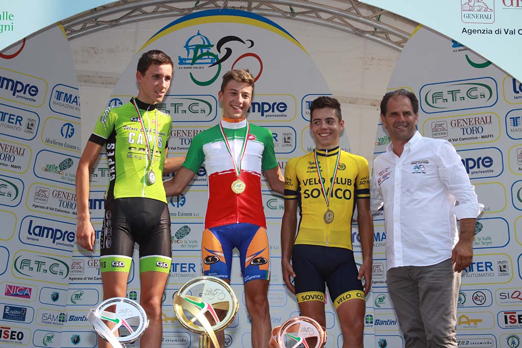 DARFO BOARIO TERME (BS) – Di imprese negli anni ci ha abituato a vederne tante Andrea Bagioli. Ma quella che ha firmato oggi è sicuramente la più bella e la più importante. Con una splendida azione solitaria, di quasi 30 chilometri, il valtellinese del Pedale Senaghese si è laureato campione italiano della categoria Allievi. Sul podio con lui, al secondo posto il veneto Filippo Zana della Cage Capes Vc Silvana e terzo un altro lombardo, il lecchese Luca Colnaghi del Velo Club Sovico.