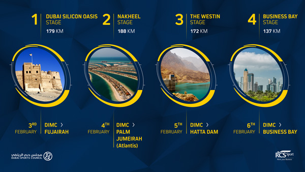 In programma ci sono tre tappe adatte alle ruote veloci e una, la terza, The Westin Stage, più impegnativa. Le novità dell’edizione 2016 sono il primo arrivo a Fujairah Emirate (Dubai Silicon Oasis Stage) e un nuovo viale d’arrivo per la frazione finale nel Business Bay district (Business Bay Stage).
