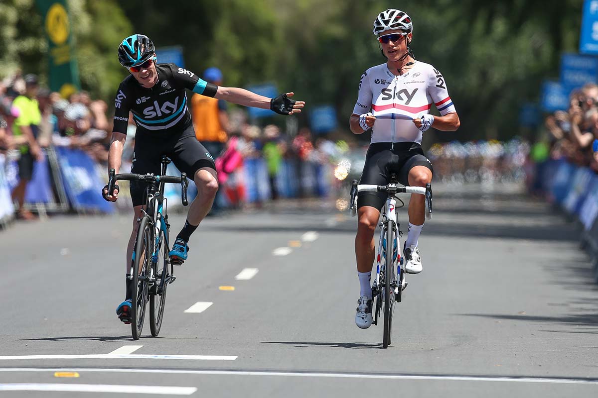 Peter Kennaugh e Chris Froome, arrivo in parata nella prima tappa dell’Herald Sun Tour (foto Con Chronis)