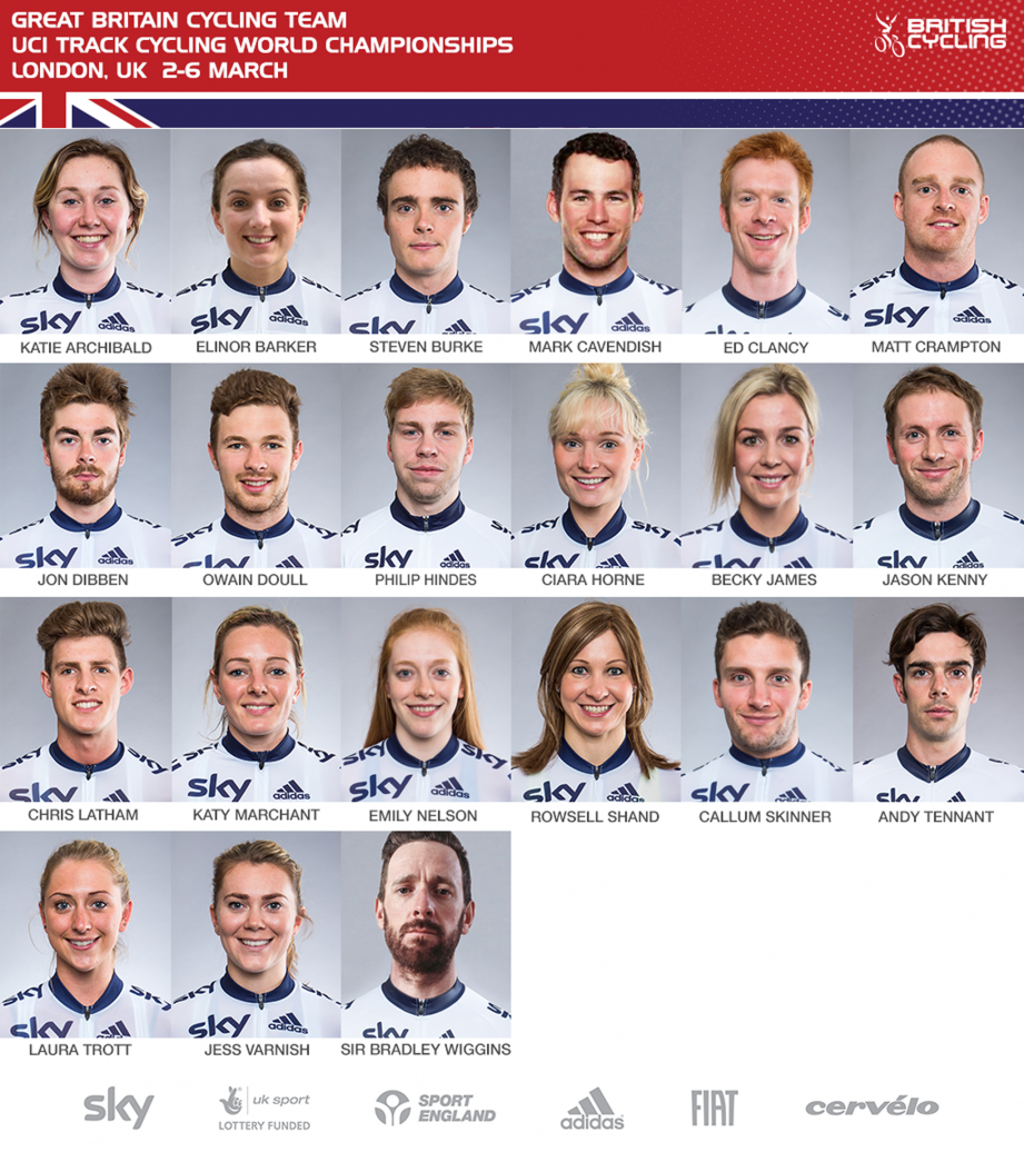 Laura Trott, Joanna Rowsell Shand, Ed Clancy, Steven Burke, Jason Kenny e Phil Hindes ritorneranno nel velodromo che fece da cornice ai loro successi alle Olimpiadi di Londra 2012, mentre Emily Nelson e Chris Latham per la prima volta prenderanno parte al Mondiale Elite.
