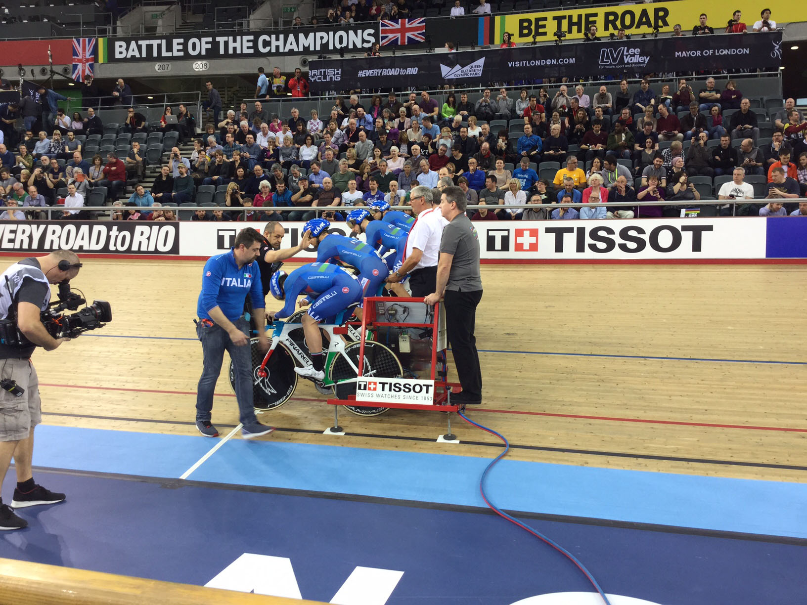 Soddisfatto il CT Villa: “Siamo riusciti ad esprimere il nostro vero valore dimostrando di essere alla portata della qualificazione olimpica che ci è sfuggita lo scorso anno. Dopo una buona preparazione avvenuta durante tutto l’inverno con un gruppo affiatato oggi l’Italia ha messo in luce determinazione, forza e carattere. Lo step più difficile è stato superato e domani gli azzurri sfideranno la Gran Bretagna del fuoriclasse Wiggins. Credo sia uno stimolo in più per l’Italia che correrà consapevole dell’onore di questa sfida”. I quattro moschettieri azzurri, dopo la giornata inaugurale di oggi e con il tempo registrato, entrano nella storia del ciclismo italiano registrando il nuovo record italiano sfondando i 4’00” del quartetto azzurro che nel 1996 corse ai mondiali Manchester: Capelli, Citton, Collinelli e Trentin. Per la manche di domani il CT Villa al posto di Viviani, in riposo per l’omnium, inserirà Scartezzini e non esclude un possibile inserimento del giovane e talentuoso Ganna.