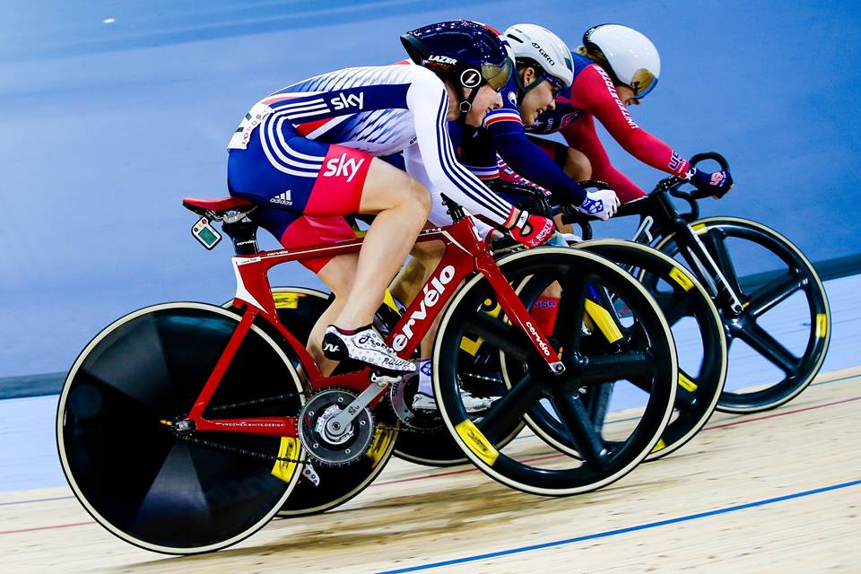 Laura Trott, Laurie Berthon e Sarah Hammer nella prova Scratch dell’Omnium femminile (foto @SWPix/UCI)