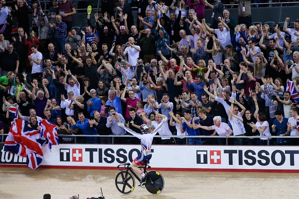 Il britannico Jason Kenny esulta col suo pubblico per la conquista del Mondiale della Velocità (foto @SWPix/UCI)