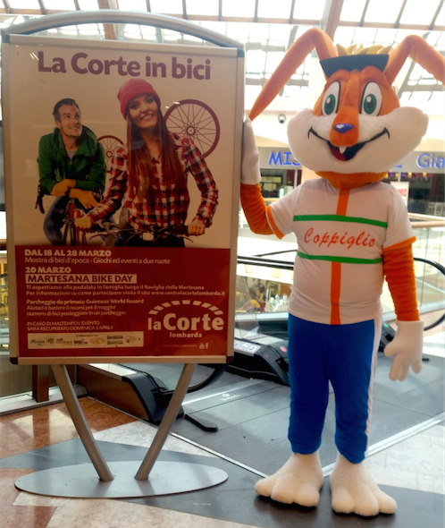 La mascotte dell’ evento, che cade in periodo pasquale, sarà un enorme coniglio ciclista, l’iperattivo e frenetico Coppiglio. In vari luoghi strategici di Milano, sia in ambito lavorativo che nei giorni festivi avvicinerà i passanti per proporre loro domande di sensibilizzazione, fotografie, giochi e simpatici sketch di intrattenimento. La mascotte ispirerà anche diverse scuole che realizzeranno la storia di Coppiglio a fumetti. Dal 18 al 28 marzo Coppiglio si sposterà all’interno del centro commerciale dove, grazie al suo potente integratore, il CAROTADE, sfiderà con energia e simpatia tutti i passanti.
