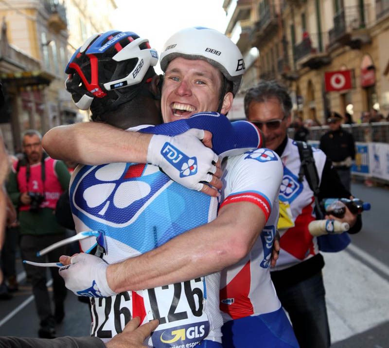 1 Arnaud Demare (Fra) FDJ km 295 in 6h54’45” media 42,676 km/h