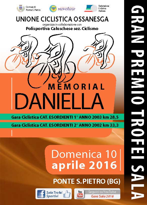 PONTE SAN PIETRO (BG) – Una nuova gara si aggiunge al calendario bergamasco degli Esordienti: è il Memorial Daniella – Gran Premio Trofei Sala in programma domenica 10 aprile a Ponte San Pietro (Bergamo).