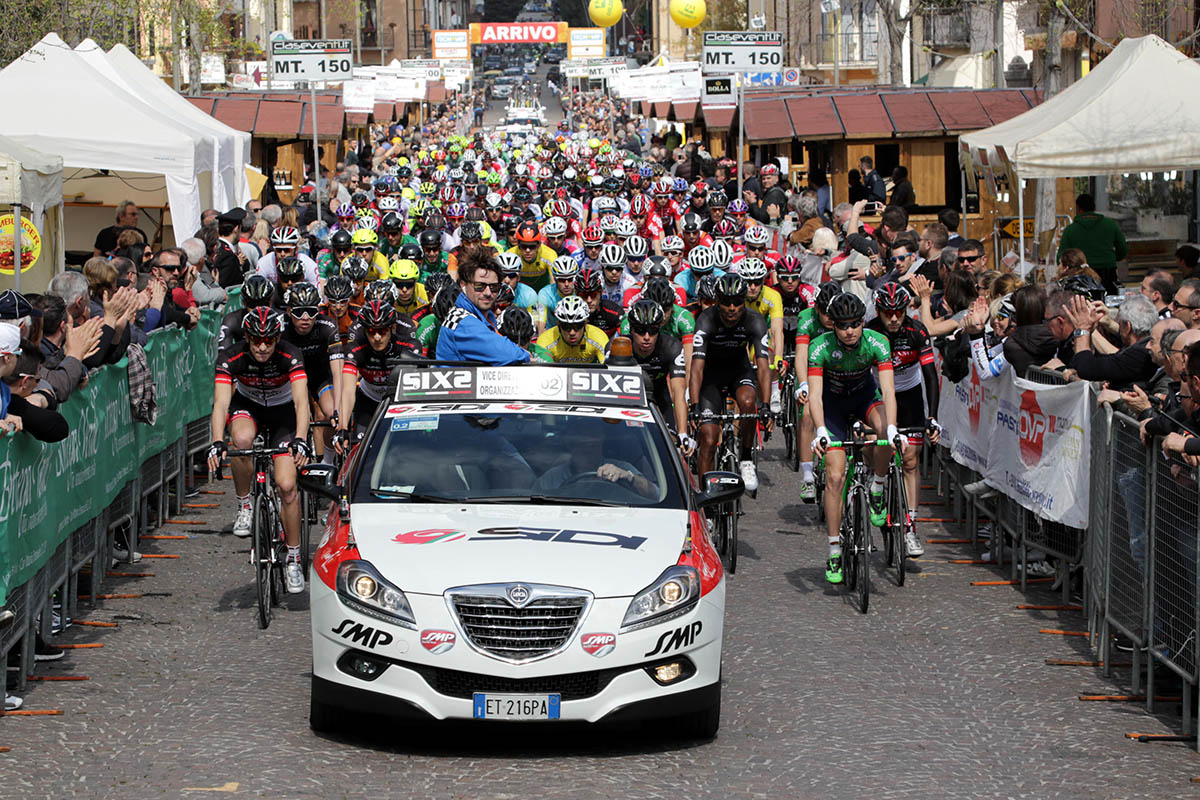 Ma è proprio a questo punto che dietro si organizzano, in testa al gruppo si vedono soprattutto le maglie del Team Colpack e dell’Unieuro Wilier Trevigiani, e allora il divario inizia inesorabilmente a scendere. Nel volgere di 7-8 chilometri il gruppo si porta già a soli 2 minuti dai fuggitivi.