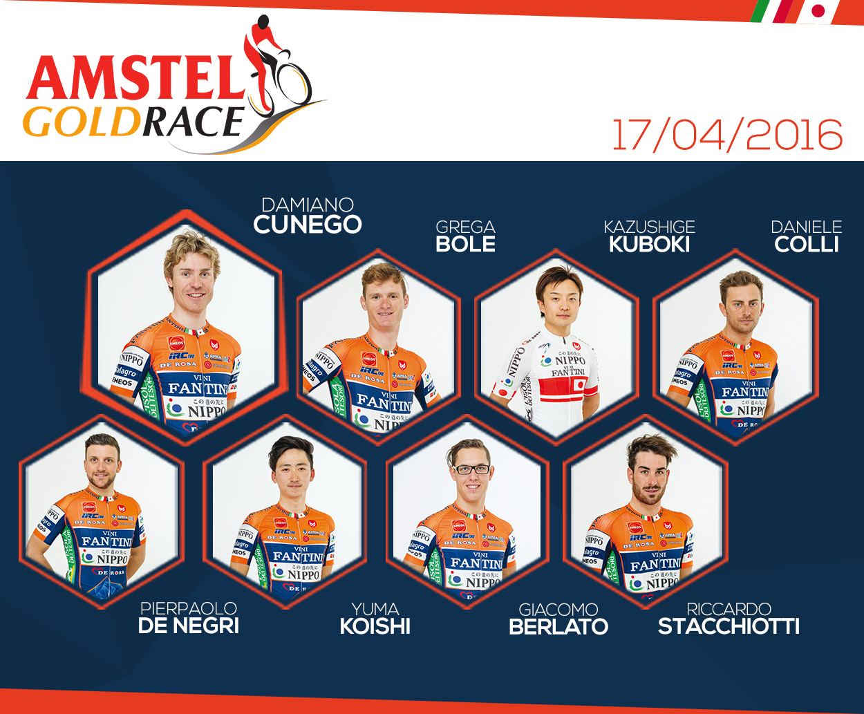 La 51° edizione dell’Amstel Gold Race, sarà quella del duplice debutto dei giovani campioni nipponici. Il campione nazionale giapponese Kazushige Kuboki, fresco di convocazione Olimpica per Rio 2016, affronterà per la prima volta la corsa del nord e il leggendario Cauberg. Con lui Yuma Koishi, il campione asiatico under23, che al suo primo anno con il team si è già conquistato l’opportunità di disputare questa corsa World Tour. L’esperienza di Daniele Colli e Pierpaolo De Negri tornerà molto utile al team in questa corsa dura e selettiva, così come la freschezza di Giacomo Berlato e Riccardo Stacchiotti.
