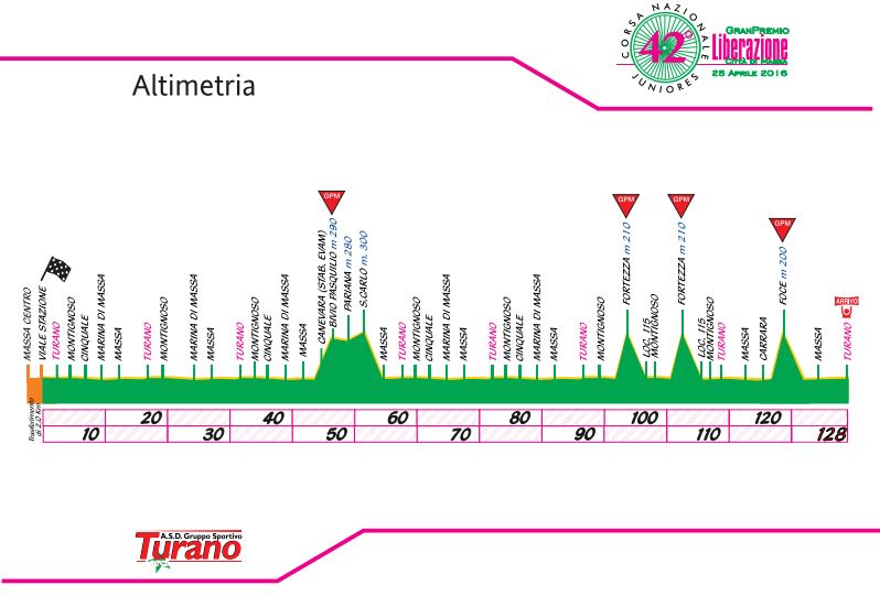 MASSA (MS) – Definita la lista delle formazioni che, il prossimo 25 aprile, saranno al via del Gran Premio Liberazione Città di Massa, gara nazionale riservata alla categoria Juniores ed organizzata dal Gs Turano in collaborazione con l’Asd Montignoso Ciclismo. Trenta squadre si sfideranno sull’impegnativo percorso che porterà gli atleti dalla partenza ufficiale posta a Massa di fronte alla pasticceria Tonlorenzi al traguardo di Turano. Saranno al via le migliori formazioni italiane, la nazionale della Russia e le francesi La Pomme Merseille ed il Velo Club Rochevillois. La novità dell’edizione 2016 del Gp Liberazione Città di Massa sarà il maxi schermo in zona arrivo posizionato sul truck dove si svolgeranno le premiazioni.