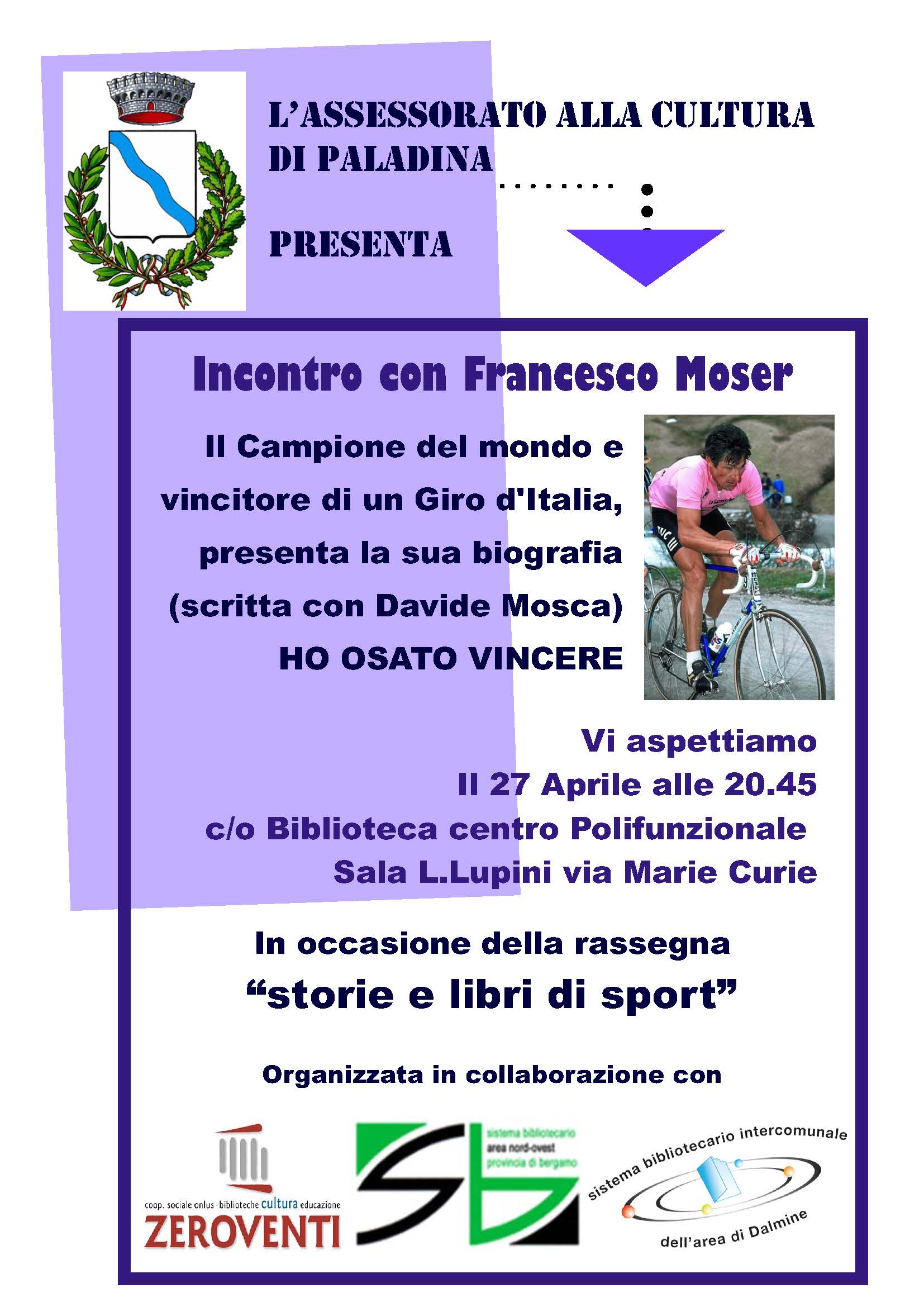 PALADINA (BG) – L’iniziativa “Libri e storie di sport” guarda ancora al ciclismo e dopo l’incontro con Pinotti a Brembate Sopra lo scorso 17 marzo, domani, mercoledì 27 aprile, alle ore 20,45, alla Biblioteca Centro Polifunzionale di Paladina (Sala L. Lupini via Marie Curie) arriva il grande Francesco Moser.