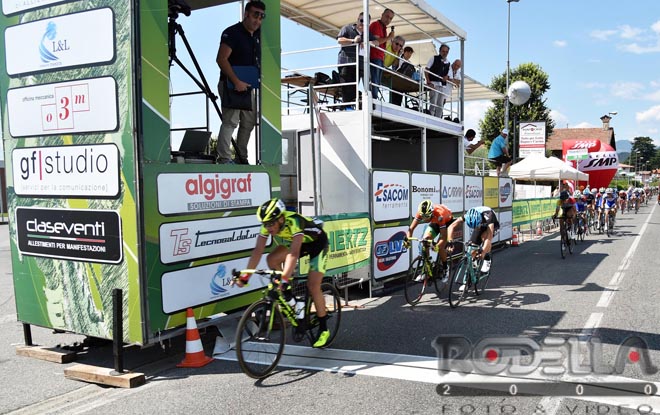 Dopo essere entrati nel circuito finale di Adro, al traguardo volante del 60° chilometri passa per primo Simon Giacomello (Pressix) che precede e toglie la maglia di leader della speciale classifica al compagno Tommaso Campesan e Antonino Mirra (Contri Autozai) è terzo.
