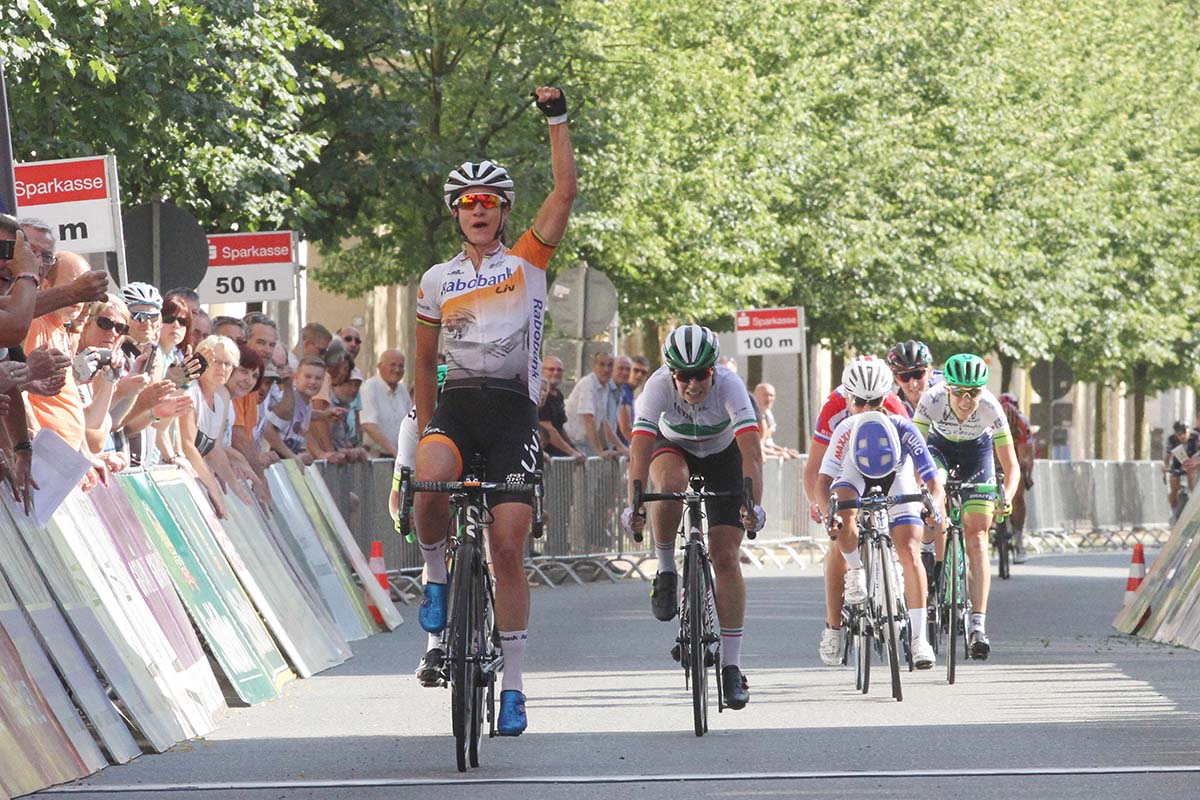 La quinta tappa odierna, con arrivo a Greiz, si è decisa sullo strappo finale di 450 metri dove sono rimaste in una trentina di atlete a giocarsi la vittoria. Ottimamente pilotata dalla compagna Roxane Knetemann, la Vos ha fatto emergere tutta la sua forza nel finale, ha tagliato per prima il traguardo alzando il pugno al cielo (foto Sportfoto.nl).