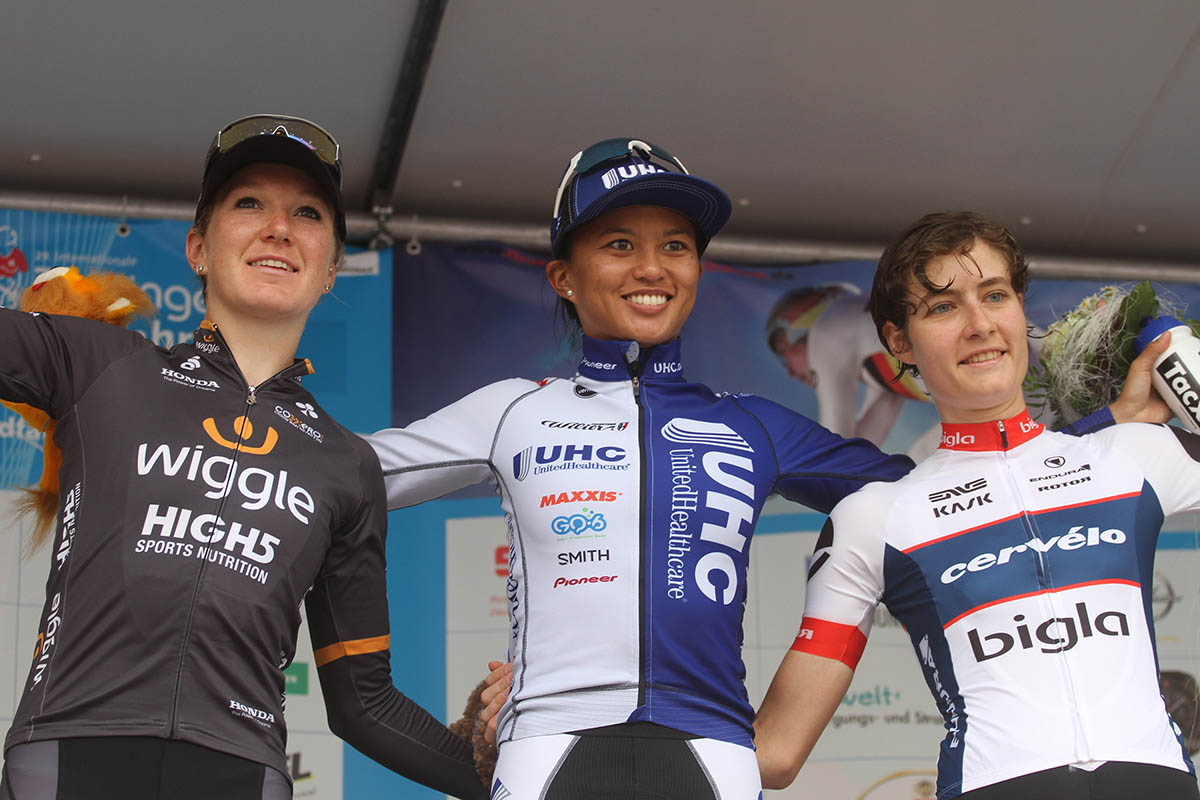 Il podio finale del Thüringen Rundfahrt der Frauen 2016 vinto da Elena Cecchini (foto Sportfoto.nl)