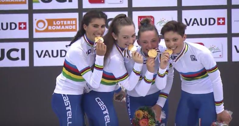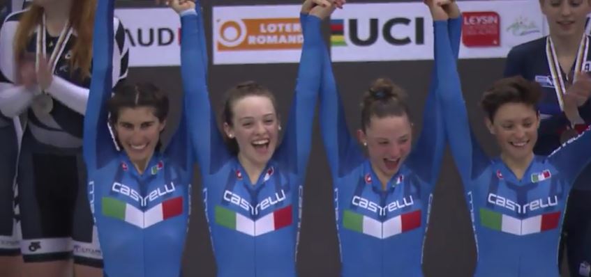 AIGLE (SVIZZERA) – Il quartetto azzurro delle meraviglie è campione del mondo! Vendicata alla grande Astana, con le azzurre che hanno corso fin dall’inizio praticamente in tre, perché Martina Stefani caduta nelle semifinali si è staccata quasi subito. La dea bendata è stata in questo caso equanime, perché anche la Nuova Zelanda ha perso un vagone per caduta. Perciò finale tre contro tre con le azzurrine che hanno quasi raggiunto le rivali. Medaglia d’oro per Elisa Balsamo, Chiara Consonni, Martina Stefani e Letizia Paternoster. Per la trentina si tratta del secondo oro consecutivo dopo quello ottenuto ieri nella Corsa a punti.