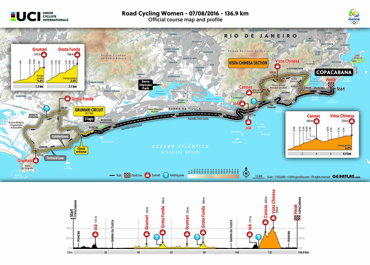 • Il secondo circuito è quello di Canoas/Vista Chinesa che le ragazze affronteranno una sola volta; il circuito comincia con la salita di Canoas e poi prosegue con quella di Vista Chinesa per un totale di 8,9 km di scalata seguiti da una discesa tecnica di 6 km. Vista Chinesa è un luogo simbolo del Brasile posto all’interno del Tijuca National Park