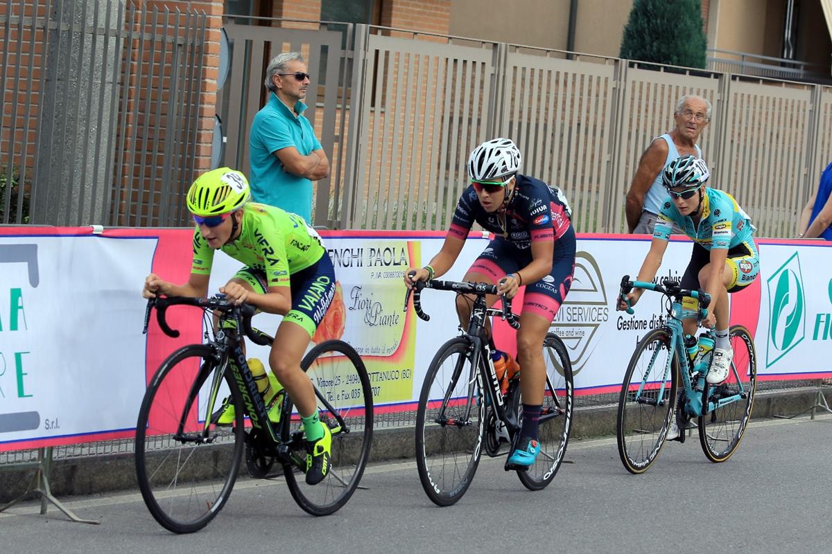Nel corso della seconda parte della gara il gruppo si ricompatta nuovamente. Nasce un nuovo tentativo di fuga grazie all’azione del terzetto composto da Anna Stricker (Inpa Bianchi), Elena Franchi (Aromitalia Vaiano Fondriest) e Ilaria Sanguineti (BePink). Le tre di testa guadagnano fino a 18” prima di essere raggiunte da Arianna Fidanza (Astana Women’s Team) e successivamente da tutto il gruppo.