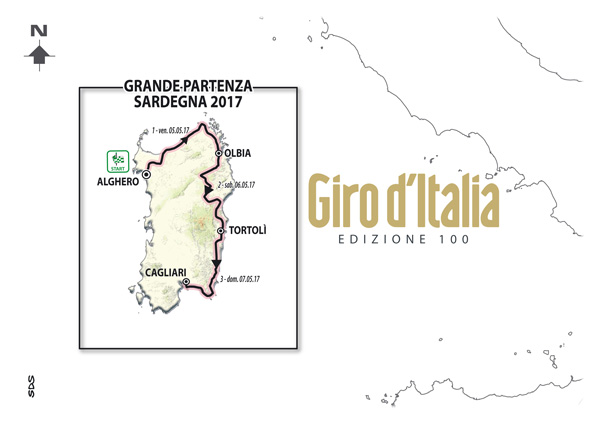 MILANO (MI) – Un’edizione storica, la numero 100, quella che il Giro d’Italia si appresta a vivere nel 2017 e che partirà dalla Sardegna per la terza volta nella sua lunga vita. La Grande Partenza della Corsa Rosa, organizzata da RCS Sport/La Gazzetta dello Sport e in programma da venerdì 5 a domenica 28 maggio, è stata presentata questa mattina a Milano. Il percorso sull’isola prevede tre tappe in linea: la Alghero-Olbia di 203 km, la Olbia-Tortolì di 208 km e la Tortolì-Cagliari di 148 km.