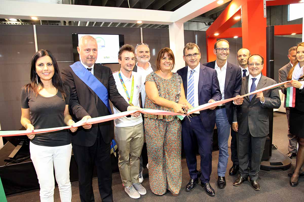 Taglio del nastro con Elia Viviani, medaglia d’Oro di ciclismo su pista Omnium a Rio 2016, e con Barbara Degani, sottosegretario al ministero dell’Ambiente.